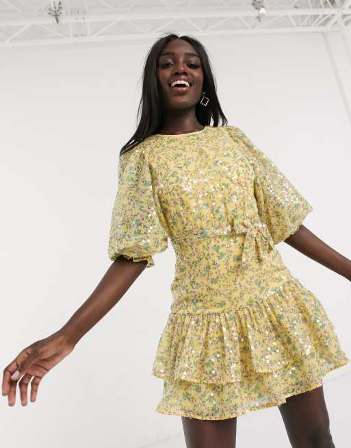 ASOS EDITION paillette sequin mini dress with faux feather hem in yellow Very well made.