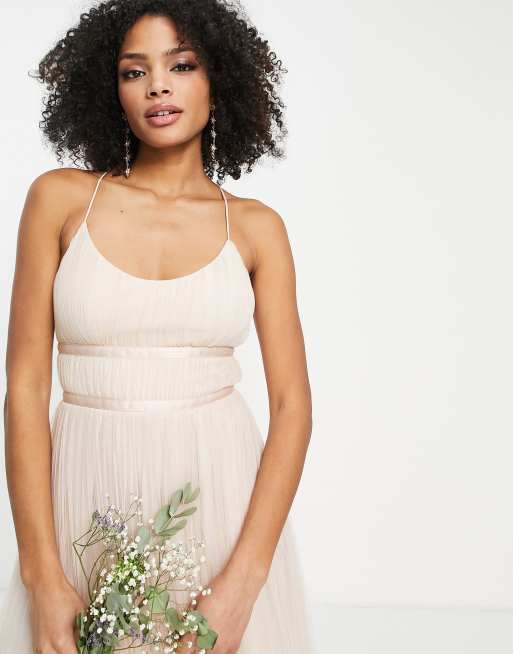 ASOS DESIGN bridesmaid tulle cami maxi dress with satin ribbon waist detail and pleated skirt in champagne Very well made.
