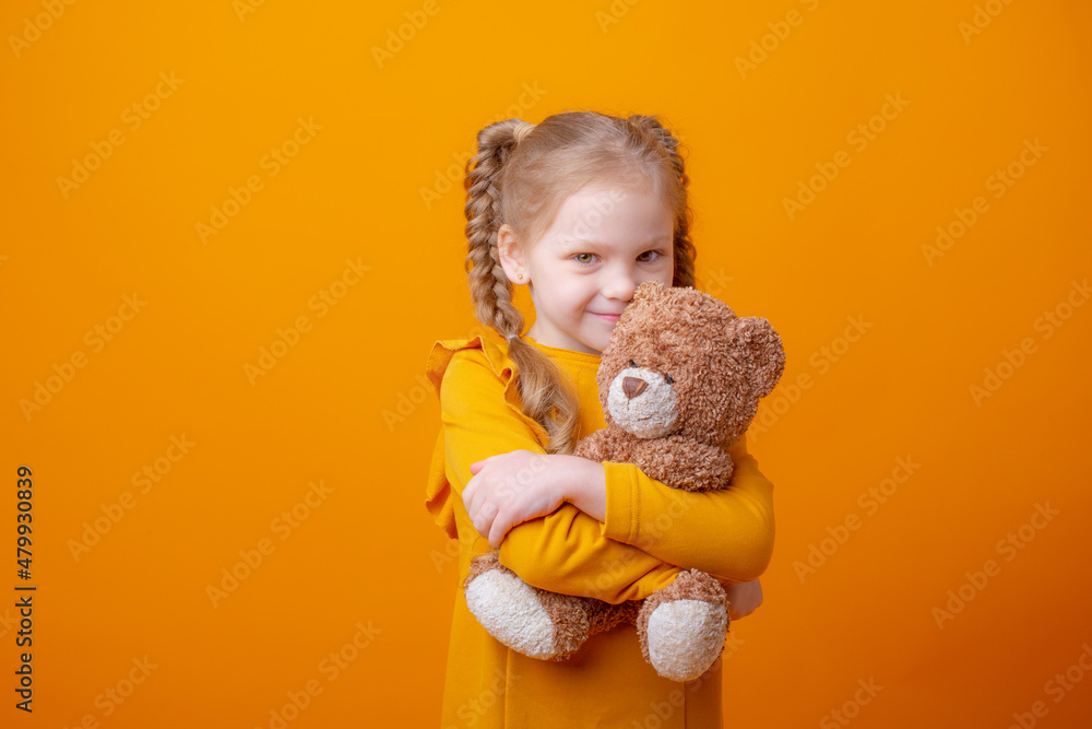 Foto de cute little girl holding a teddy bear on a yellow Very well made.