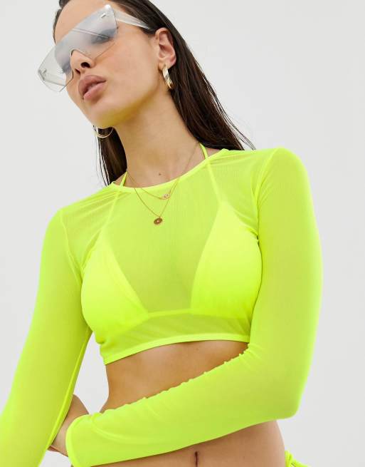 ASOS DESIGN mesh long sleeve bikini top in neon green Very well made.