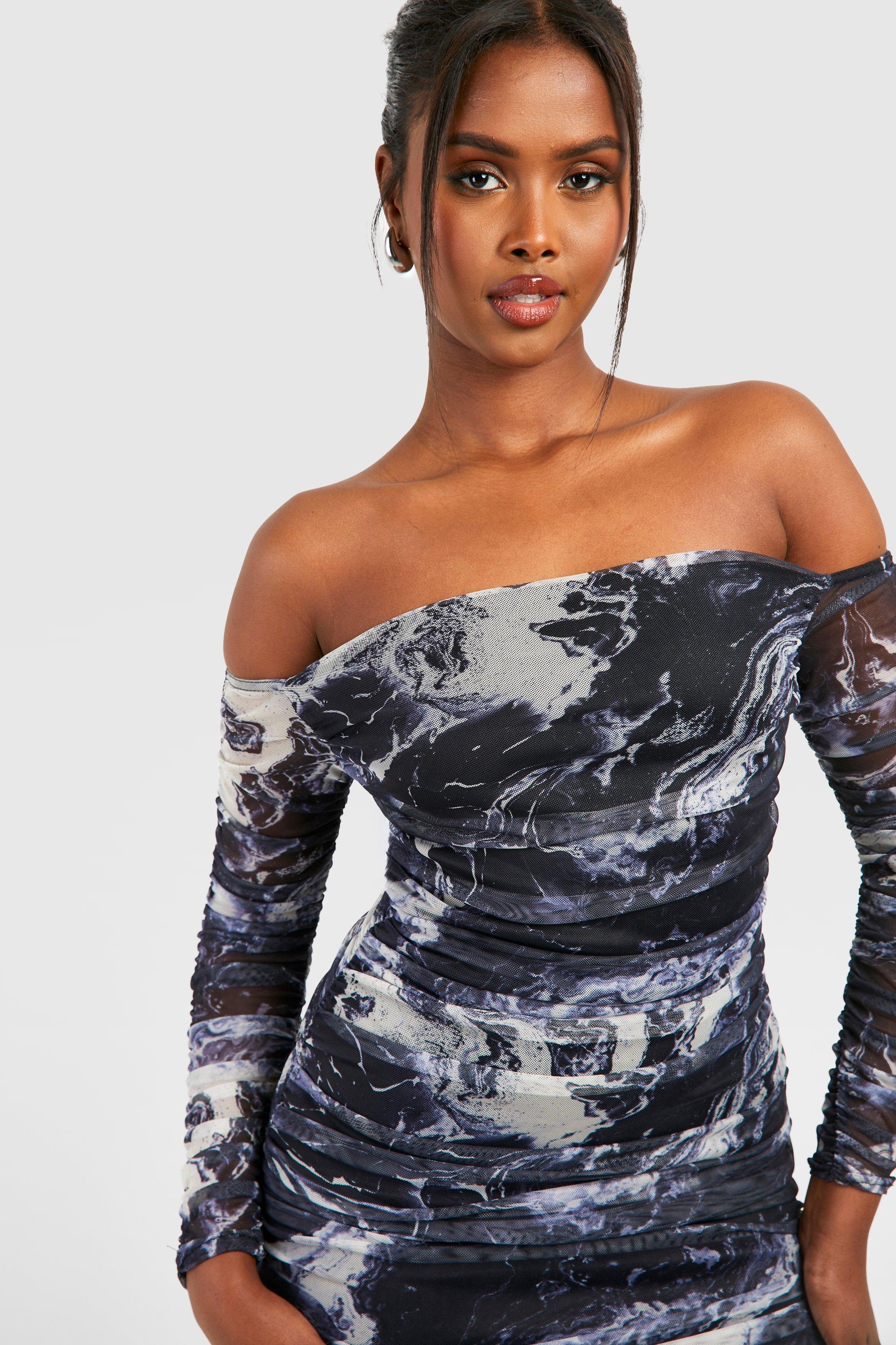 Women s Bardot Floral Print Ruched Mesh Mini Dress Boohoo UK Very well made.