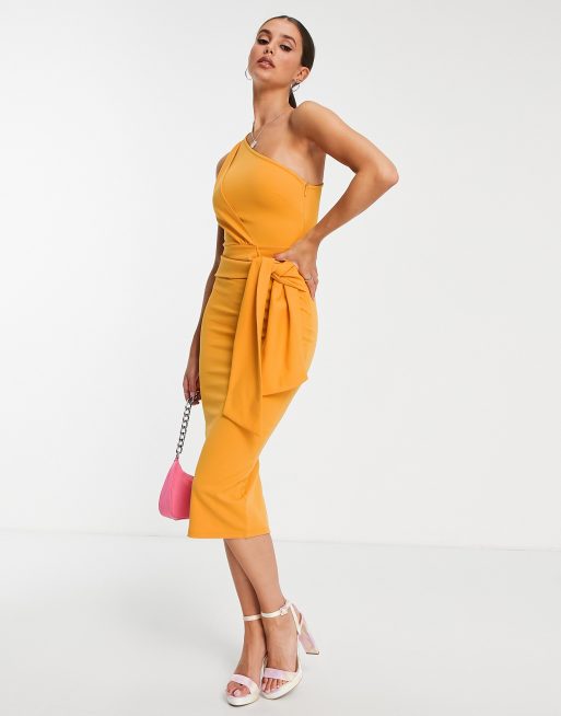 ASOS DESIGN fallen one shoulder gathered midi pencil dress with wrap in mustard Very well made.