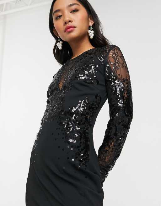 Lipsy Petite long sleeve lace applique maxi dress in black Very well made.