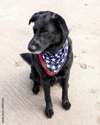 Black lab on sand wearing American flag bandana Stock Photo Very well made.