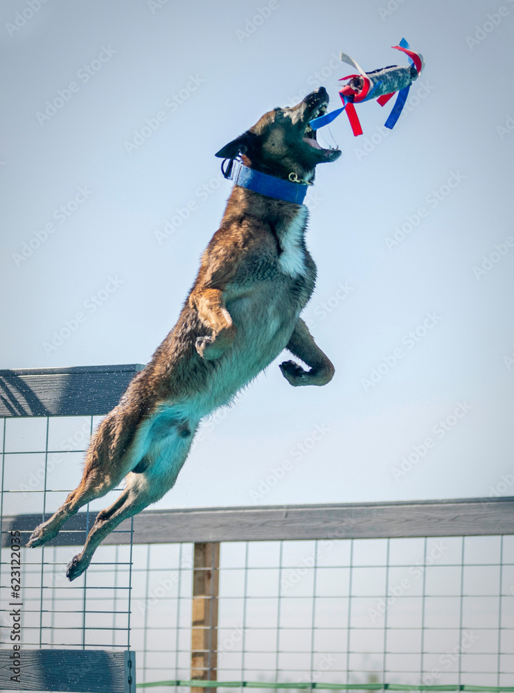 Brown Belgian Malinois dock diving and catching a toy after Very well made.