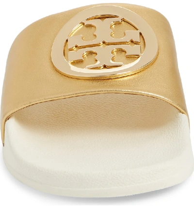 Lina Metallic Leather Pool Slide Sandals In Gold Very well made.