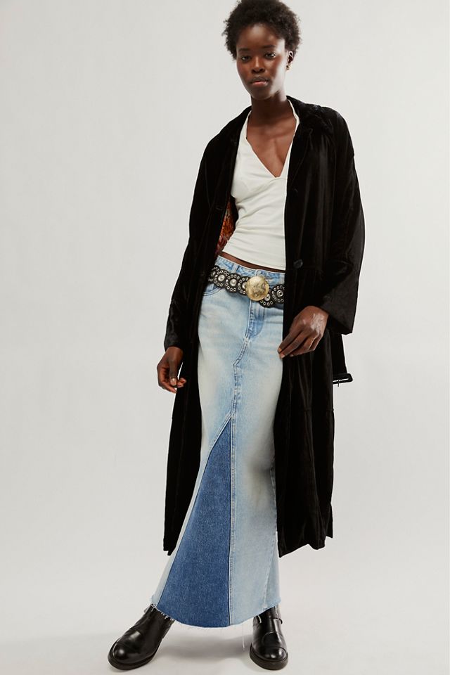 Free People Denim Punk Ruffles Tiered Hem Duster Long Jacket XS Very well made.