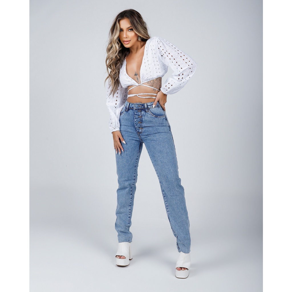 Cal a Feminina Mom Jeans Com Pin a Very well made.