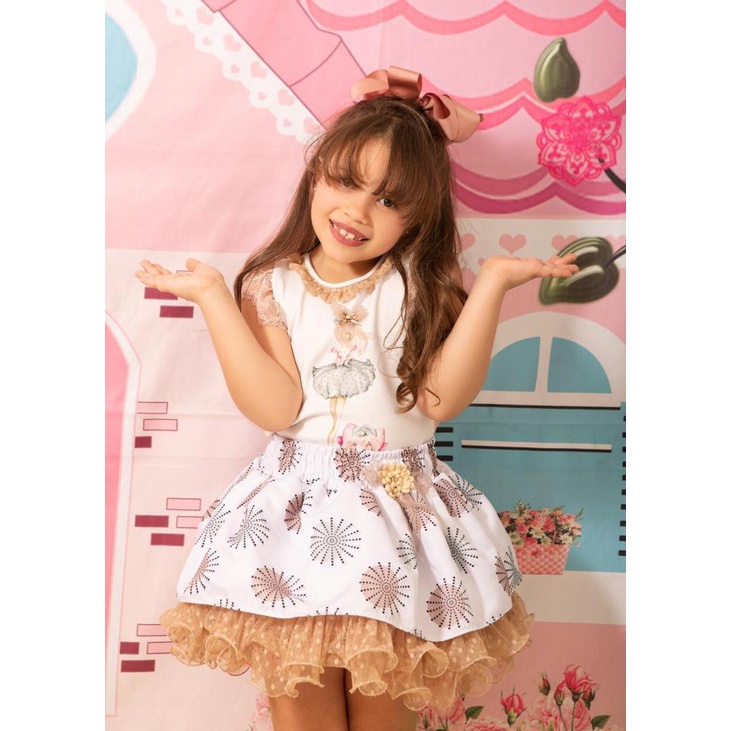 Conjunto Infantil Blusa Manga Curta Renda e Saia Rodada Off White Very well made.