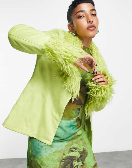 COLLUSION faux suedette jacket with faux fur trims in light green Very well made.