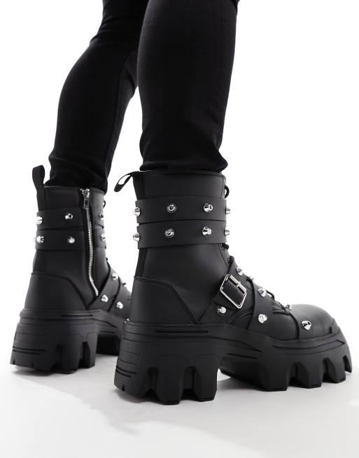 ASOS DESIGN lace up boot with chunky sole and studded strapping in black faux leather Very well made.